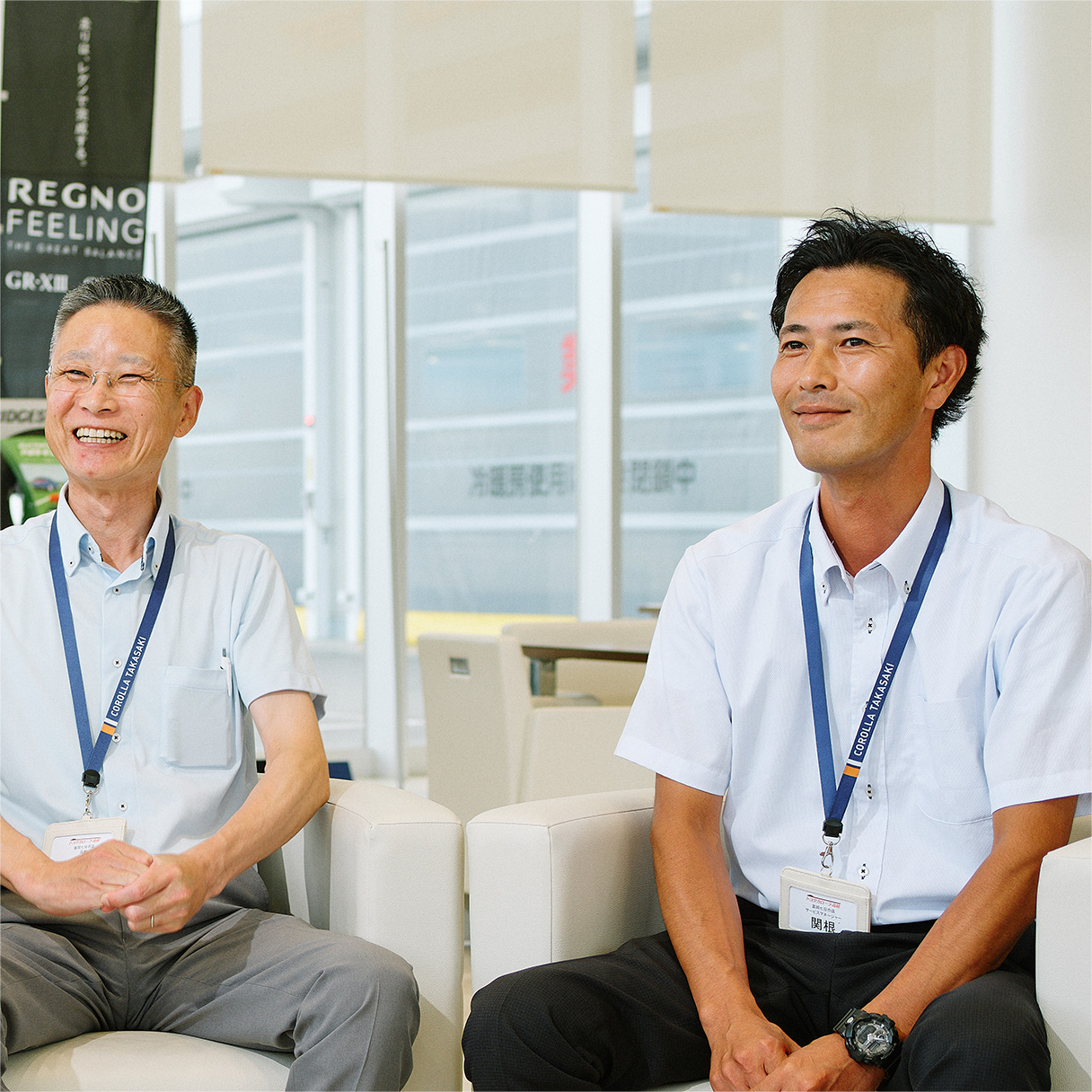 私は「また来たい」と思っていただけるように、プラスαの接客を常に心がけています。例えば、点検時に小さな傷を見つけたら、そっと直してさりげなく伝えるような。怪我が原因で現場から離れましたが、エンジニア時代にはトヨタ技術検定の最高峰「トップクルー」に認定された経験がありますので、どんな質問も即座に答えられる知識は今も大切にしています。